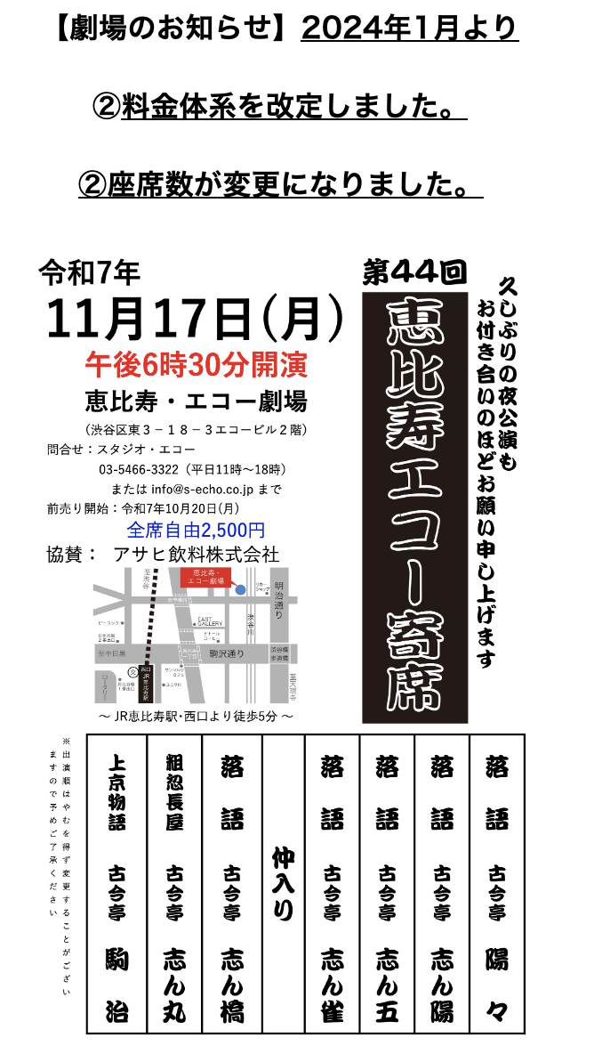 恵比寿・エコー劇場 2009/4/6 ①料金体系を改定しました。 ★劇場の空きスケジュールやレンタルに関する詳細は、 スタジオ・エコー(03-5466-3322)までお電話ください。 平日10:00〜18:00(...